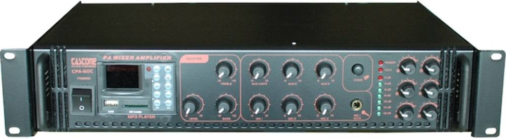 A CPA sorozat MP3 lejátszást támogató, FM tunerrel ellátott, 60W kimenő teljesítményű, három mikrofon és három vonal bemenetű, közös mély, magas hangszínszabályozóval, csatornánkénti hangerőszabályzóval rendelkező keverő erősítője 100V-os hanghálózatokhoz vagy 4-16 Ohm terhelésre használható. Az alábbi jellemzők indokolják ezen készülékek széleskörű alkalmazhatóságát intézmények, áruházak, kültéri rendezvények stb. információs és műsoros hangosítási feladataira.