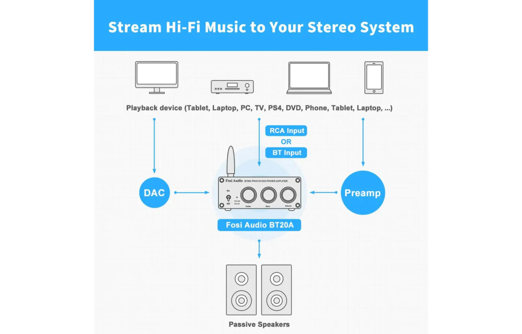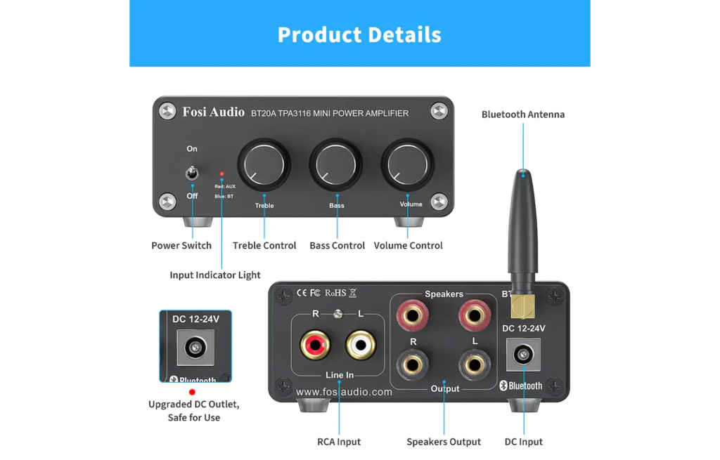 At its core, the BT20A boasts Texas Instruments TPA3116D2 chip amplification. This technology translates to efficient power delivery for rich and clear audio reproduction, ensuring you can enjoy your music or movies to the fullest. Stream music effortlessly from your smartphone, tablet, or other compatible device with Bluetooth 5.0 connectivity. No more tangled wires – the BT20A creates a clutter-free listening environment. Additionally, some models may include a 3.5mm jack for analog audio sources, offering further connection flexibility. With its compact design and powerful features, the Fosi Audio BT20A Stereo Amplifier is a compelling choice for anyone seeking a convenient and space-saving way to upgrade their home audio experience.