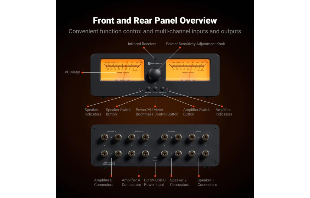 The Fosi Audio LC30 goes beyond just switching. It boasts high-quality internal components designed to preserve the original clarity of your audio signal. Some models even include informative features like dual VU meters for visual feedback on audio levels and a remote control for convenient source and speaker selection from your listening position. With its versatile connectivity options, vintage-inspired design, and focus on maintaining signal integrity, the Fosi Audio LC30 Amplifier Speaker Switcher is a compelling choice for audio enthusiasts seeking to simplify and elevate their listening experience.