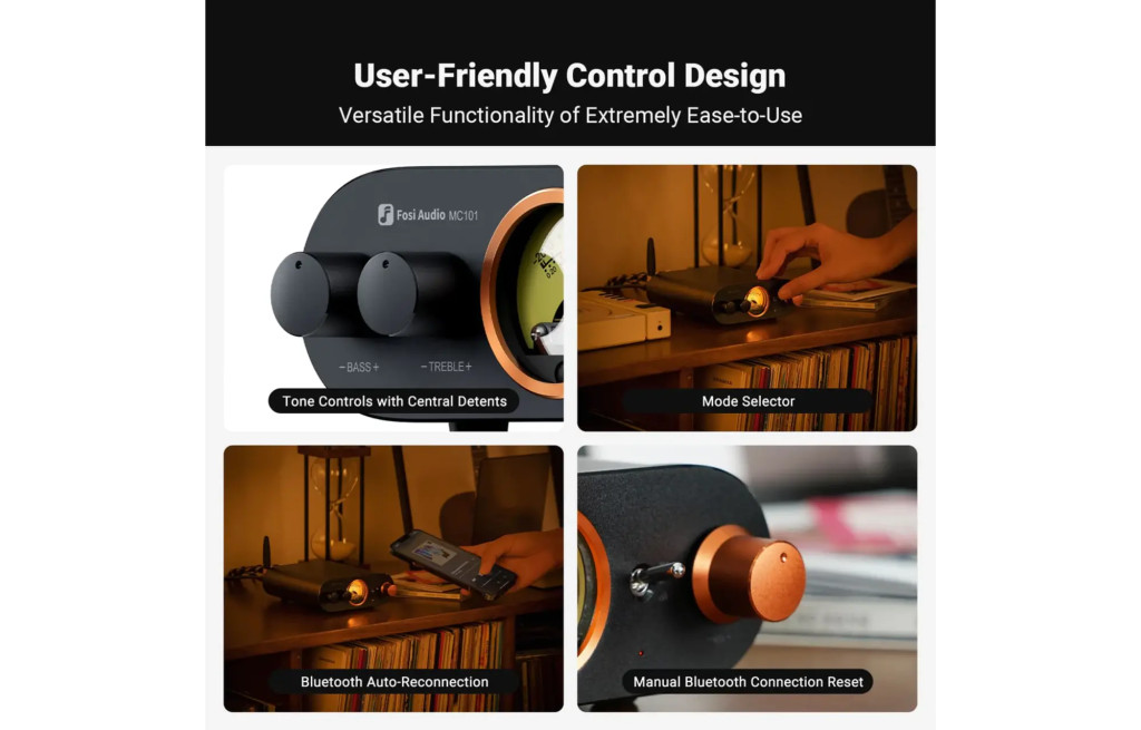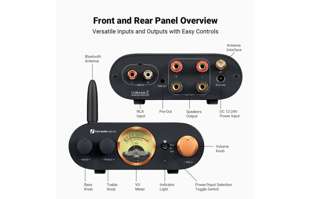 At its core, the MC101 boasts efficient Class D amplification. This technology delivers clear, powerful audio while minimizing heat generation, making it perfect for space-conscious setups. Bluetooth 5.3 connectivity allows you to stream music directly from your smartphone, tablet, or other compatible devices, eliminating the need for cables and creating a clutter-free listening environment. Additionally, RCA inputs provide a versatile wired connection option for computers, TVs, or other audio sources. With a vintage-inspired VU meter displaying audio levels, the Fosi Audio MC101