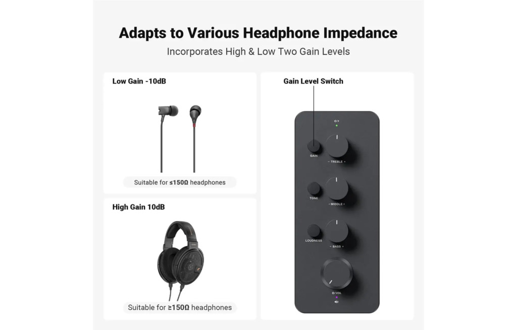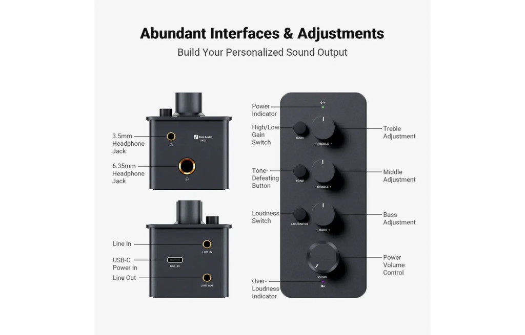 The SK01 empowers you to take control of your audio. With built-in tone controls for bass, midrange, and treble, you can tailor the sound signature to your preferences. Whether you crave a richer bass response or a brighter soundscape, the SK01's tone controls allow you to fine-tune the audio to your liking. Additionally, it features multiple gain levels – high and low settings – to perfectly match the amplification needs of your specific headphones. This ensures optimal performance and listening enjoyment regardless of the headphones you use.