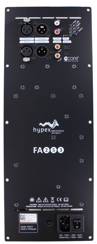 The FA253 has two 250 watt Ncore amplifiers which can also be bridged to form one powerful 500 watt amplifier. The third channel is 100 watt Ncore tweeter channel. A variety of input options ensure compatibility with most source equipment. Hypex provides their HFD (Hypex Filter Design) software to design and configure filters for the FusionAmp. You can easily add functionality to the FusionAmp with the Fusion Remote Kit for remote controllability. Due to thermal regulation these FusionAmp's are not airtight.